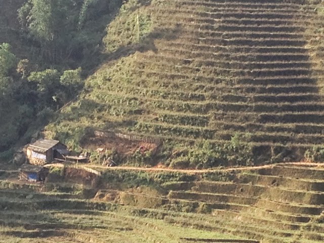 For lunch we stopped in the main Hmong village, along the main river in the valley. It had a small narrow old bridge, with small houses and a few larger shops along the bank on one side. There was a mill and a water pump building, and several homes had been turned into small restaurants. We ate a lunch of French bread, cucumber, tomato, eggs, apples, and bananas. More ladies and girls approached to sell us traditional crafts. It was interesting--most of the crafts were entirely hand made and embroidered, but these Hmong ladies were also starting to sell some machine made and embroidered pieces in the traditional style as well. Our guide said this area is entirely new to tourism, and before ten years ago, this was an inaccessible area. More and more Hmong families are starting to make part of their living selling crafts, but it's not fully accepted yet, which is why it's only the women who sell crafts. The men still do traditional work. The Hmong are a minority here in Viet Nam, and their culture and language is distinctly different.